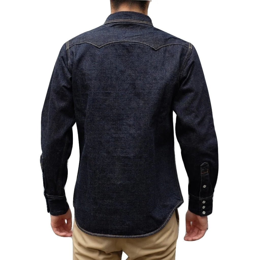 Chemise western en denim épais 14 oz. Inspirée des chemises western en denim des années 1950, elle arbore des détails vintage tels que de larges pattes de boutonnage, des boutons-pression blancs nacrés, un col long et pointu, un empiècement à l'avant et à l'arrière des épaules, et une coupe ajustée.