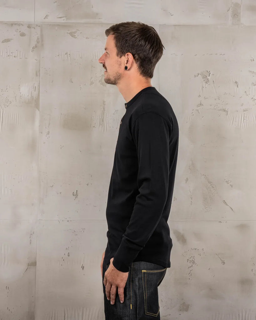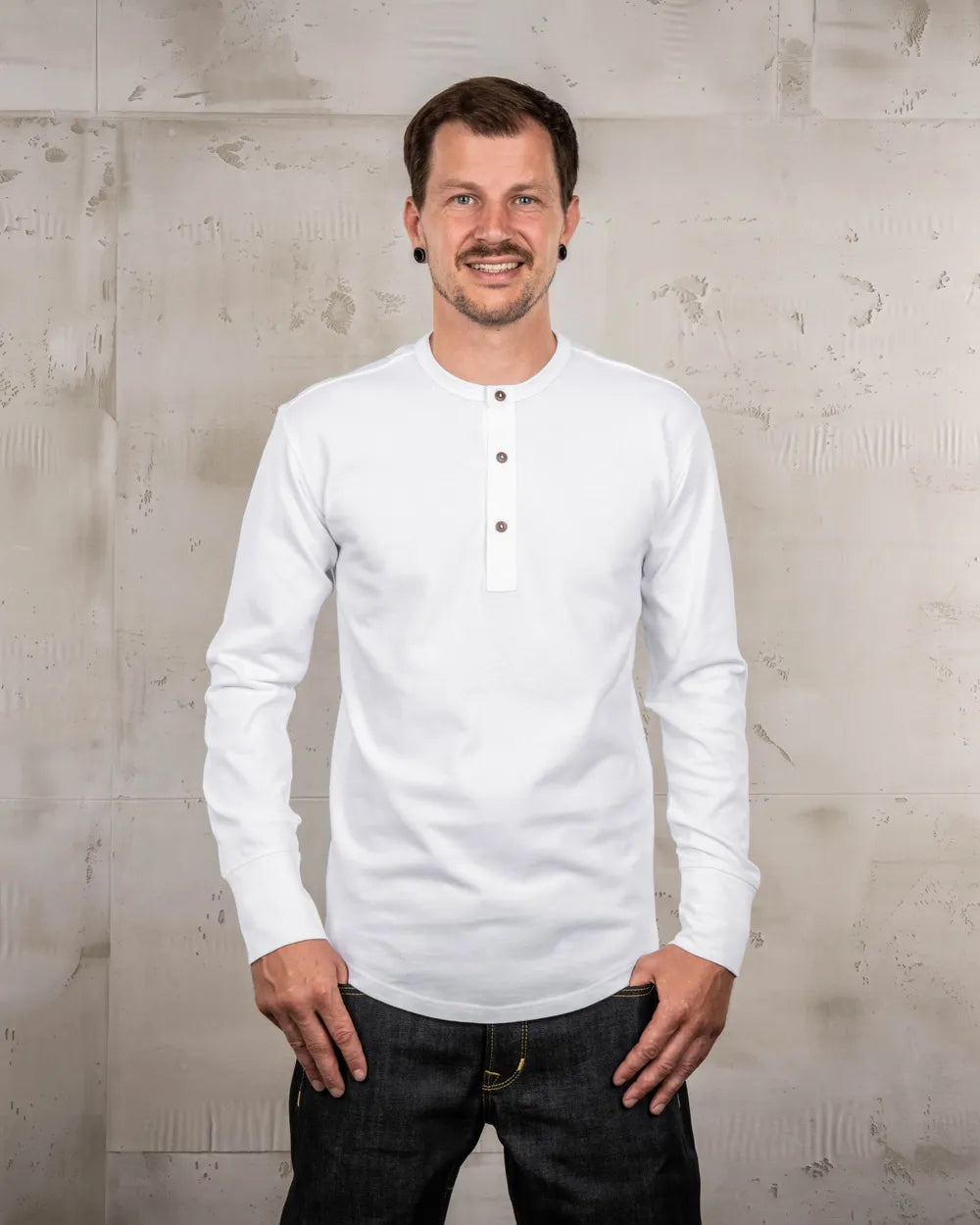 Il est plus fin que le henley 1954. C’est pour cela qu’il est plus léger et frais à porter. Il est parfait sous une chemise, ou en été comme couche de vêtement unique.