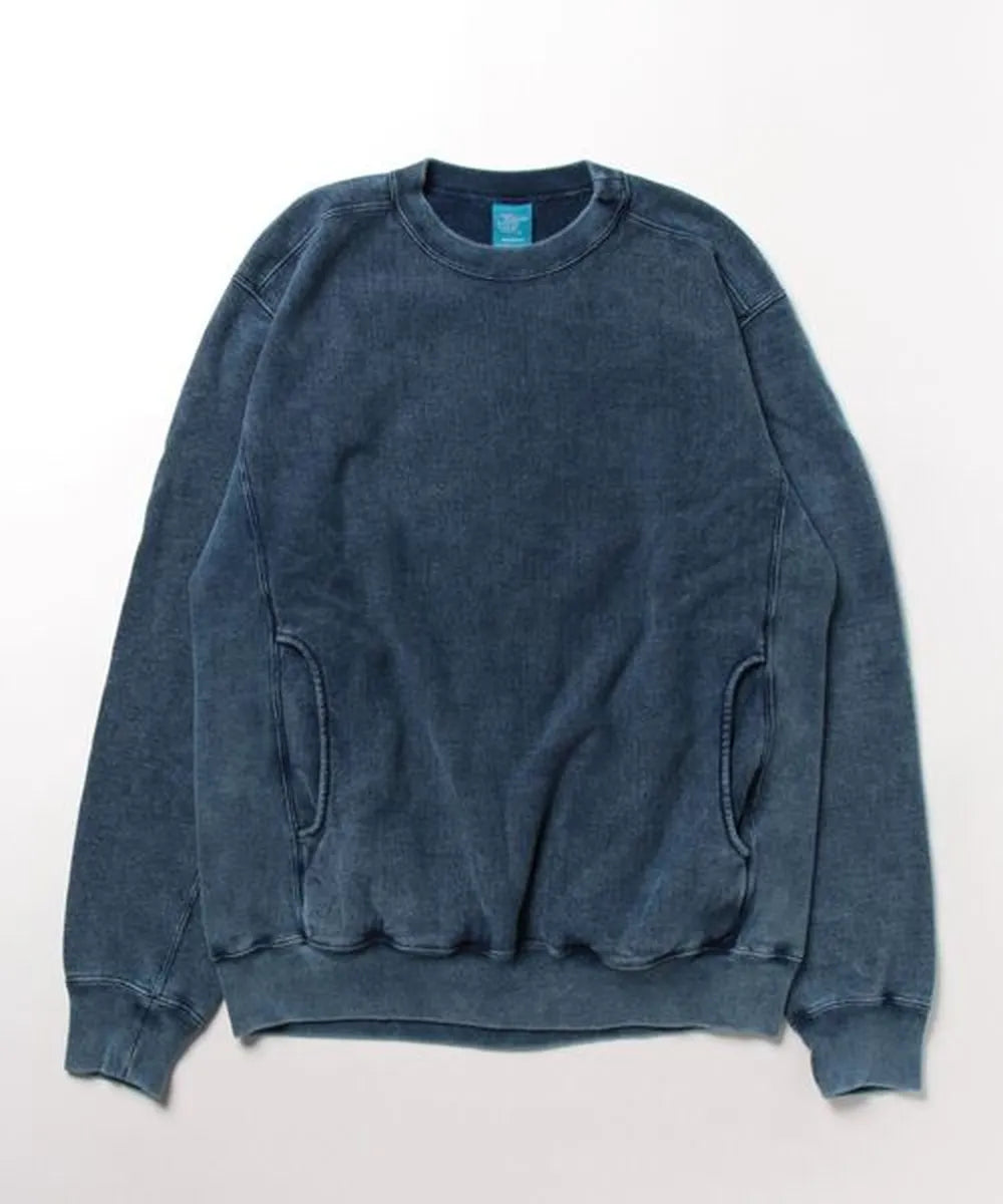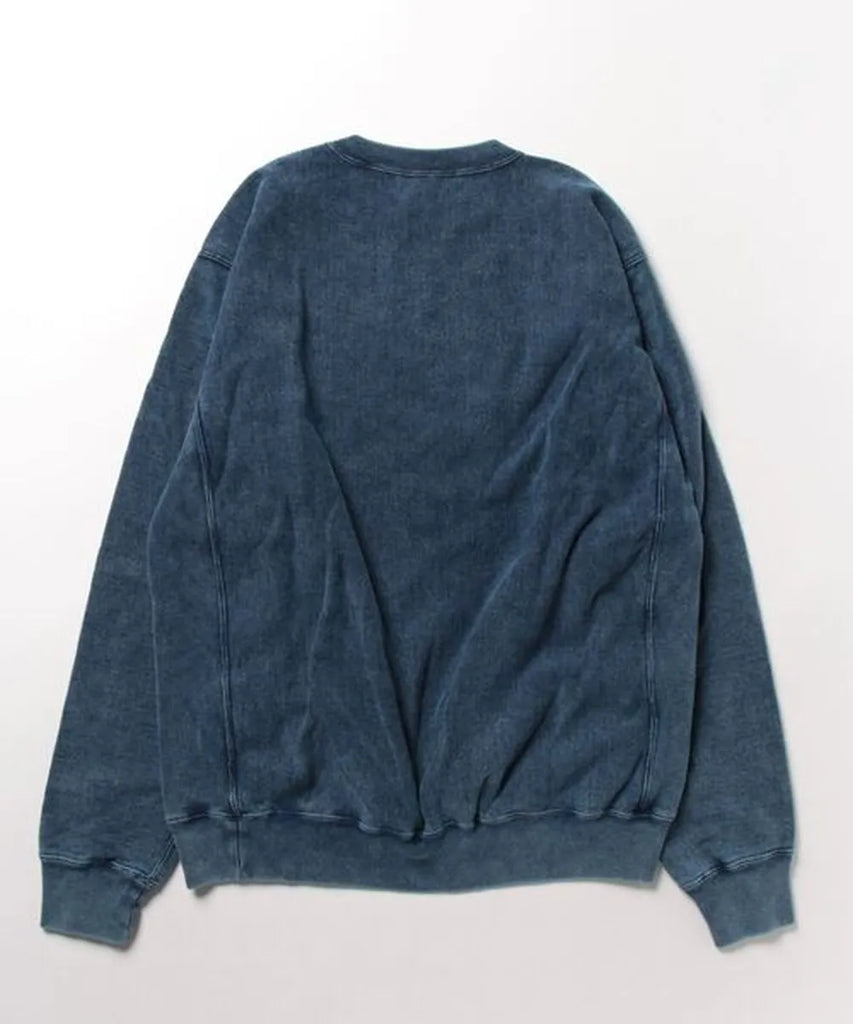 Ce sweat-shirt présente un col rond confectionné dans un molleton très épais et dense de 13 onces. Il s'agit d'une édition limitée qui bénéficie d'un traitement exclusif de teinture indigo suivi d'un procédé de "shaving" pour lui conférer un rendu visuel proche du denim vintage. Chaque pièce est teinte et travaillée à la main par des artisans, garantissant une texture absolument unique.